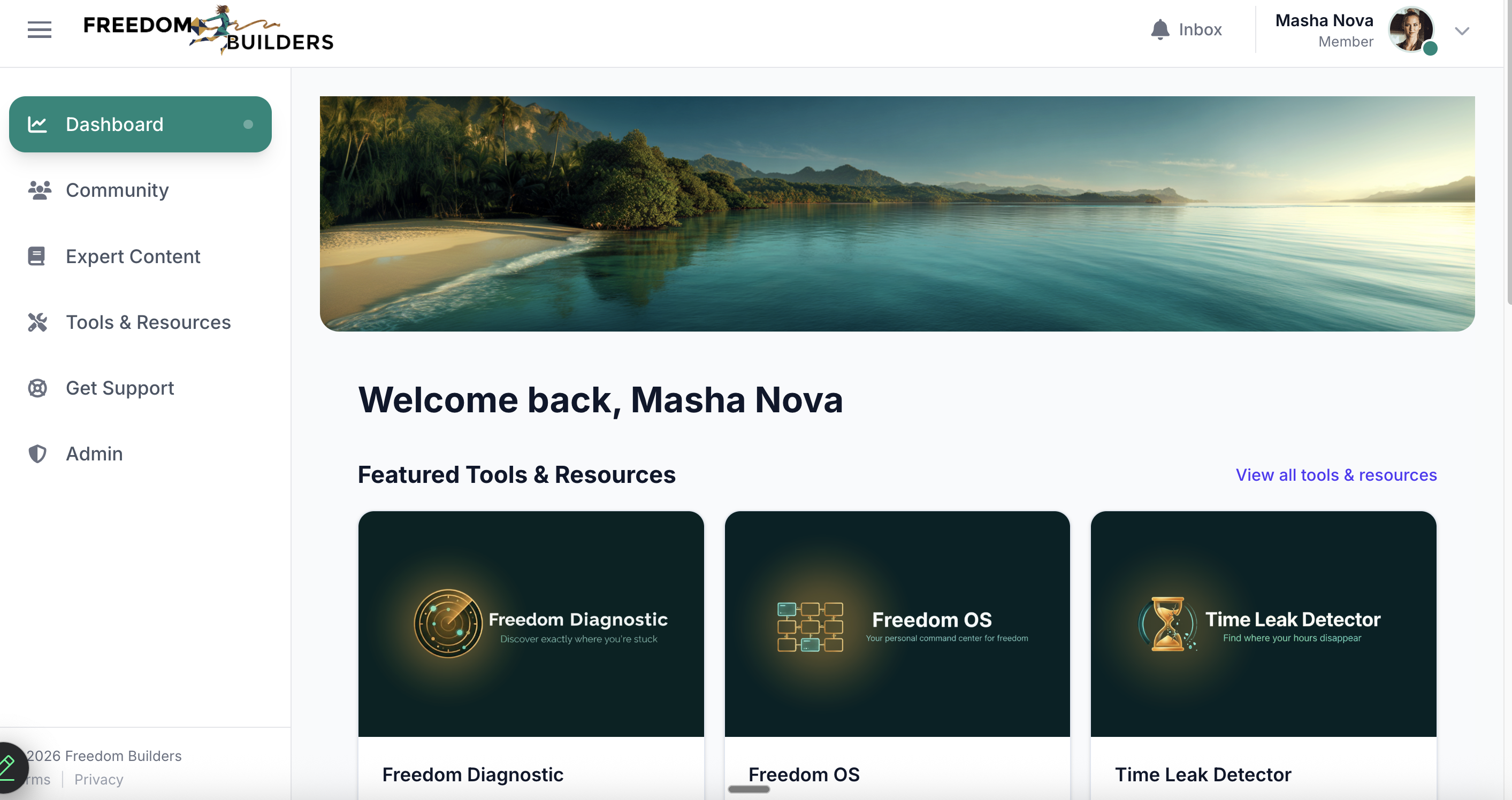 Inside Freedom Builders, you diagnose where your business depends on you too much, fix the broken pieces, install AI and systems that actually run, and track it all from one dashboard.
